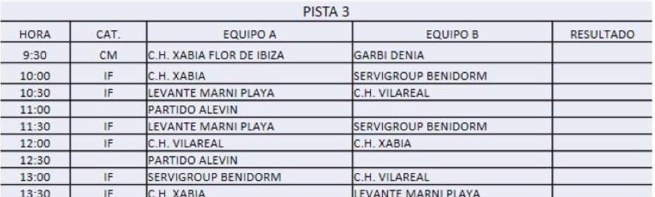 En el campo 3 de jugarán los partidos de la categoría infantil femenino entre los equipos del CH Xàbia, Servigroup Benidorm, CH Vila Real y Marni Levante. También se intercalarán con dos partidos de categoría alevín.
