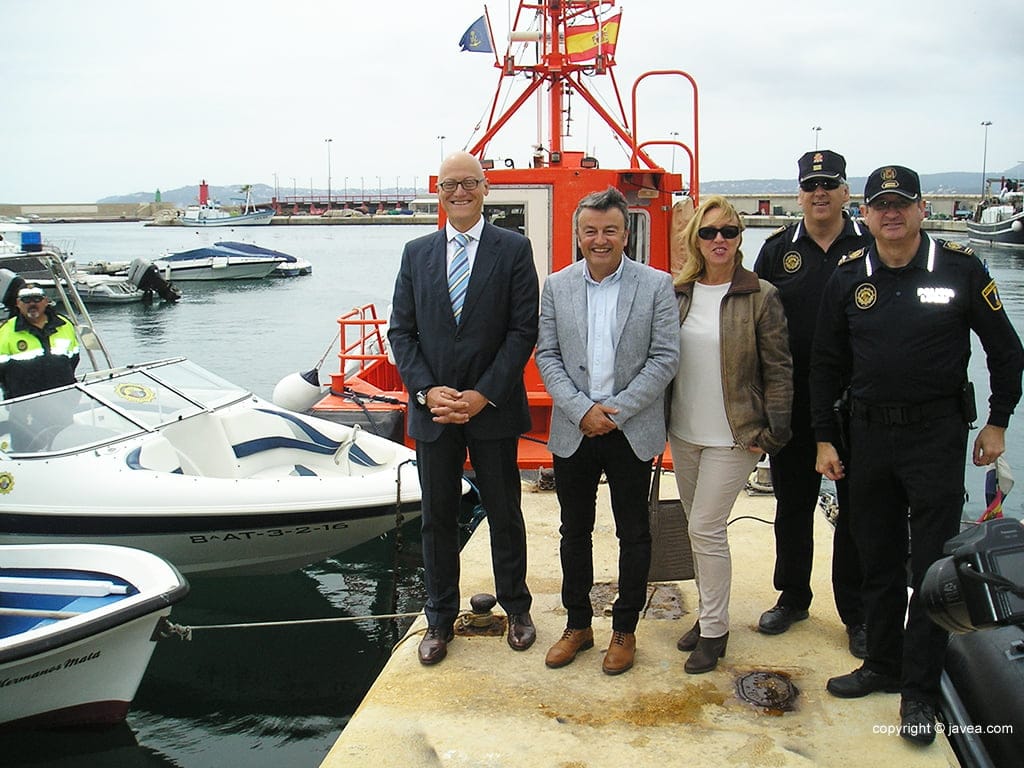 El juez Javier Reyes junto a Chulvi, Gisbert y Monfort en la presentación de la nueva barca para la Policía Local de Xàbia.