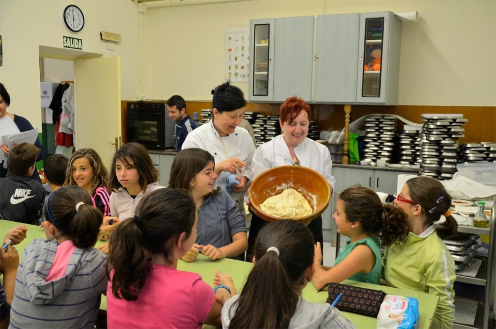 Los cocineros visitaron las clases con su llibrell (barreño de barro para preparar la masa), las mezclas de verduras, salazones y hasta un horno para explicar in situ cómo se elabora la base, los distintos tipos de relleno y conseguir que los niños se preparen sus propias cocas para almorzar.
