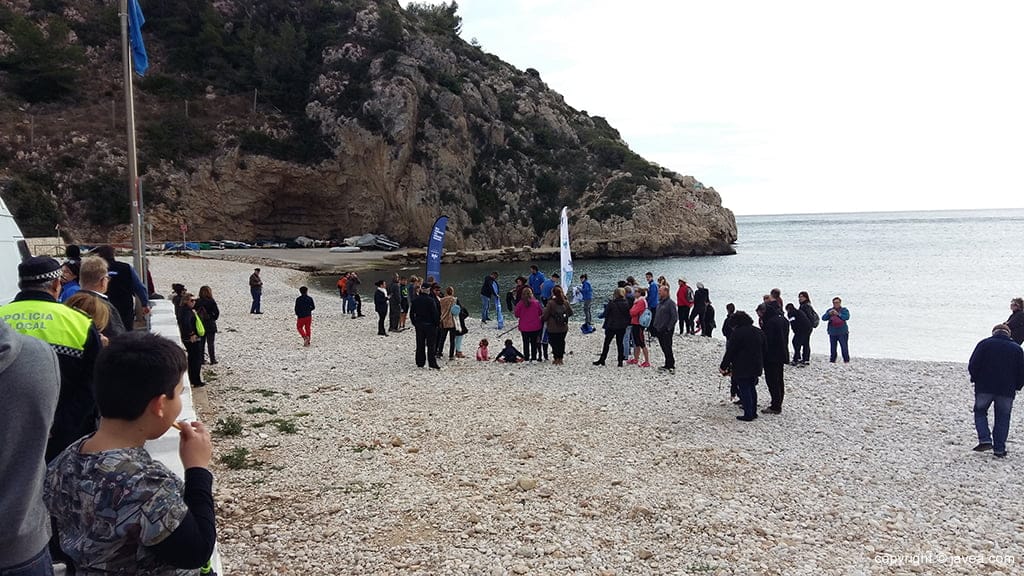 Gente en la playa de la Granadella suelta tortuga