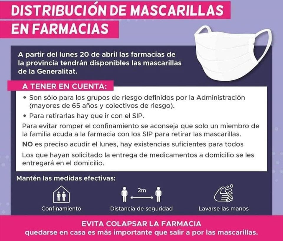 21 de abril de 2020 - 11:51 Foto Anterior3 de 3Ver el artículo original: Las farmacias de Xàbia distribuyen las mascarillas para mayores de 65 años Información sobre las mascarillas Uso de mascarillas Distribución de mascarillas