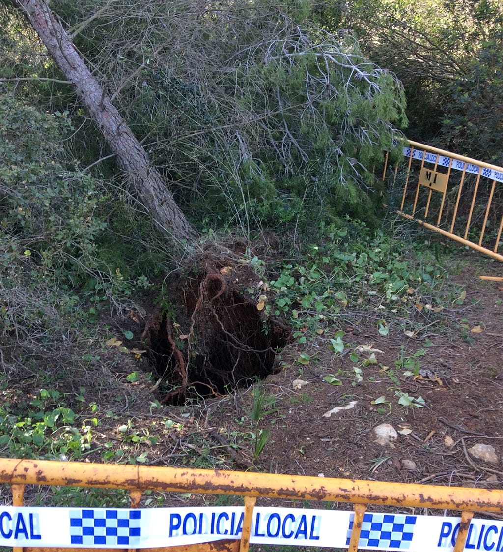 El fuerte viento de estas semanas arrancó, desde la raíz, un pino situado en la zona de La Plana de Xàbia. Este incidente dejó al descubierto una gran cavidad vertical, hasta el momento desconocida. Ahora, los expertos en geología, estudiarán esta sima, para descubrir exactamente su profundidad.