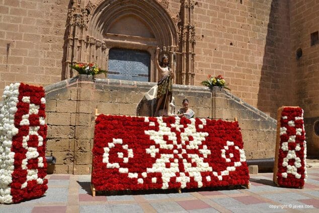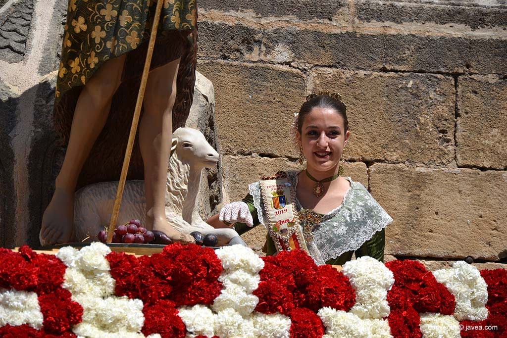 Para finalizar, la Reina Mayor de 2019, Inés Doménech, ha hecho su ofrenda de Raïm i Bacores a la imagen de San Juan situada en la Plaza de la Iglesia junto al tapiz de flores.