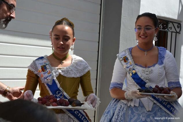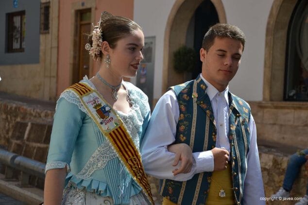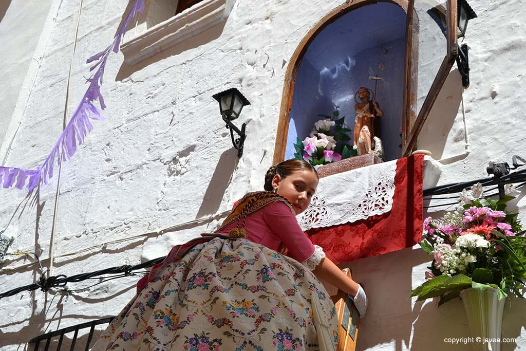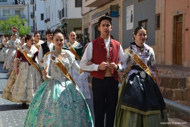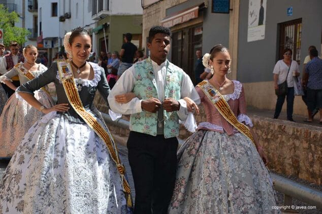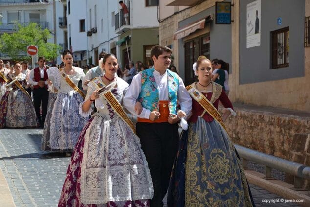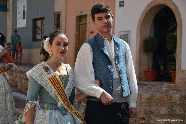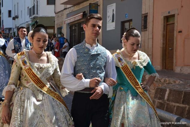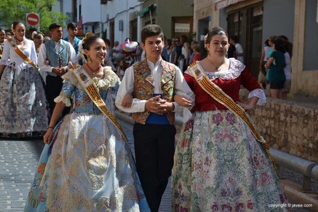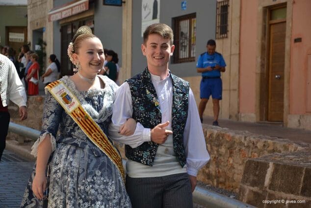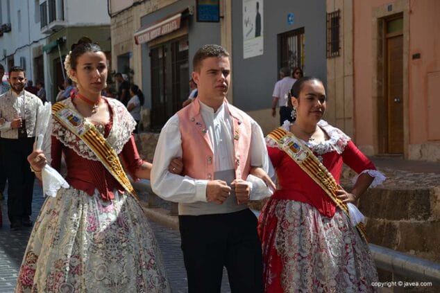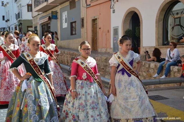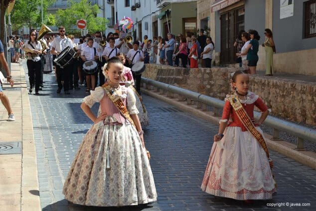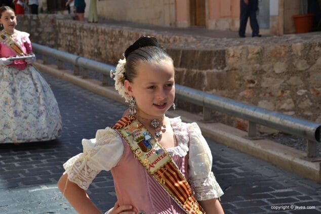Las presidentas, tanto la de la Quintà como de la Comisión Juvenil, Marina y Marián, han depositado su ofrenda en la hornacina de la calle Teulería. El pasacalle ha continuado por las calles del centro histórico hasta llegar al carrer dels Cups, donde ha sido la reina infantil, Júlia Badenes, quien ha hecho su ofrenda.