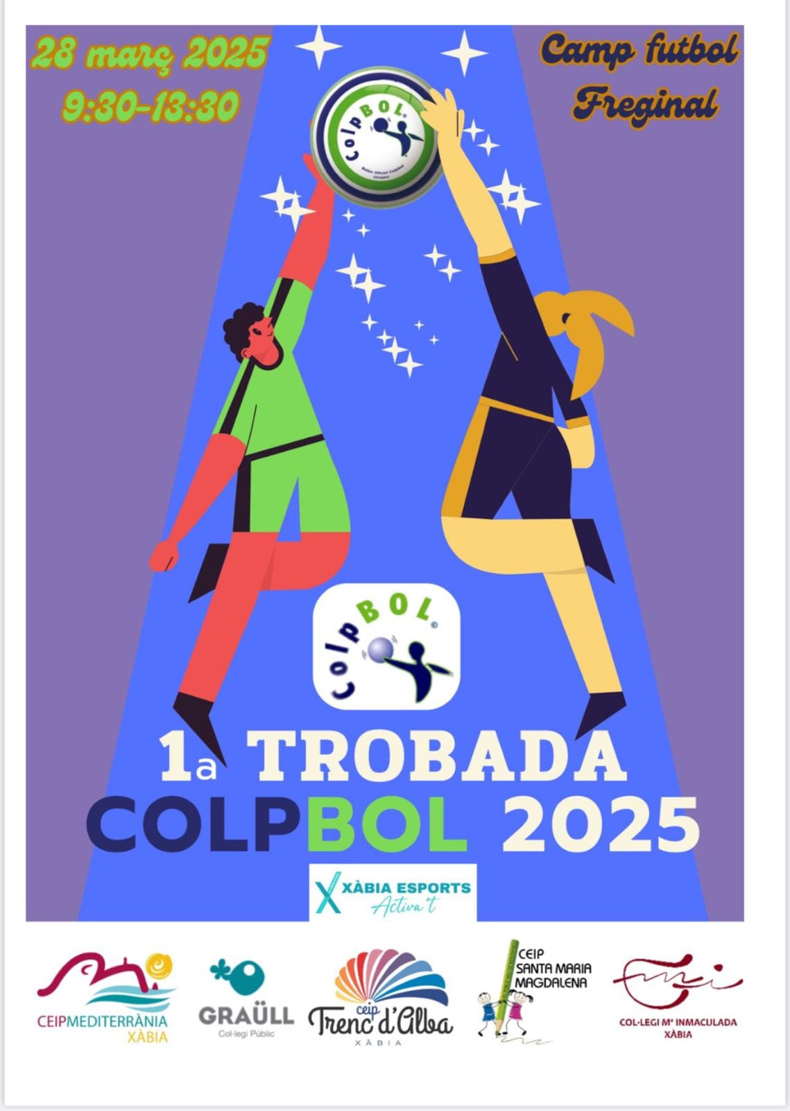 28 de marzo de 2025 - 09:23 Foto Anterior2 de 2Ver el artículo original: Los alumnos de los colegios de Xàbia y Poble Nou se unen en una jornada escolar de Colpbol Jornada de Colpbol en Xàbia Cartel Trobada Colpbol escolares Xàbia