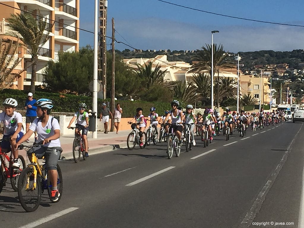 Los niños y niñas del CEIP Port de Xàbia han pedaleado con lazos negros y han exhibido una pancarta con el lema Respecta i Conviu, en la que exigían más respeto en las carreteras como condición básica para aumentar la seguridad. El lema representaba el amor que han de tenerse los coches y las bicis.