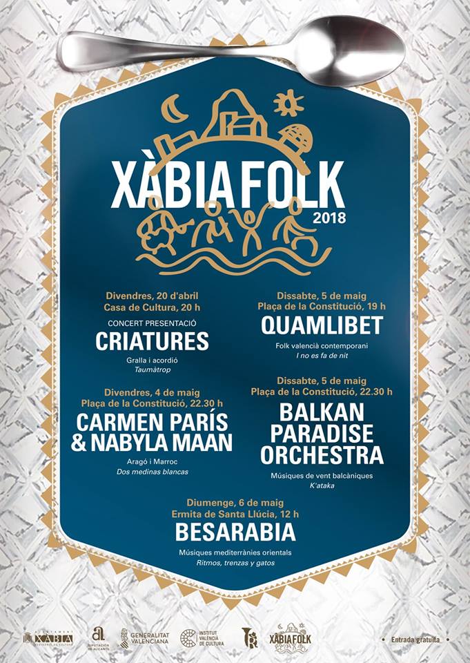 Los conciertos, totalmente gratuitos, se iniciarán el 20 de abril con la actuación del grupo Criatures. Este concierto de presentación del ciclo de Xàbia Folk 2018 será a las 20:00 horas en la Casa de Cultura. Criatures es un dúo compuesto por Ivó Jordà (gralla) y Marçal Ramon (acordeón diatónico), que con su disco Taumàtrop juegan a buscar un sonido camerístico a las sonoridades mediterráneas.