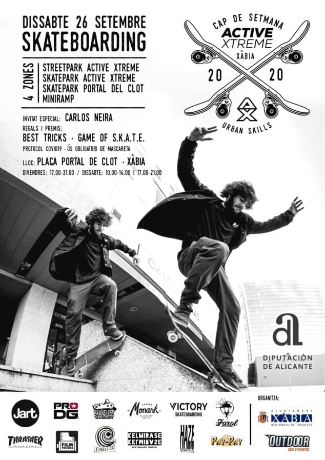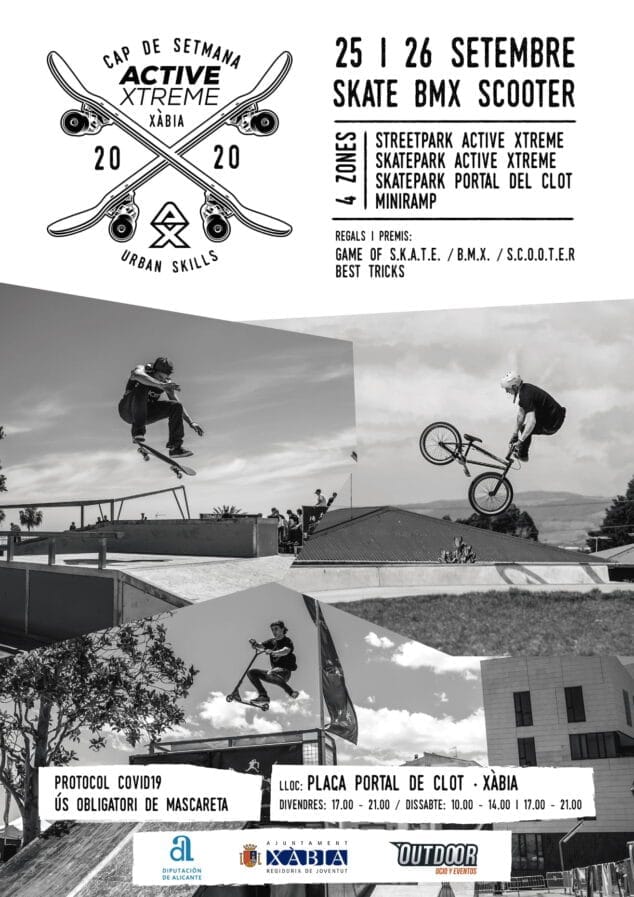 El departamento de Juventud de Xàbia ha organizado para este fin de semana (25 y 26 de septiembre) una serie de actividades de ocio activo dirigidas a adolescentes. Bajo el slogan Active Xtreme Xàbia, se podrá disfrutar de exhibiciones y circuitos de SKATE, BMX, y SCOOTER con Carlos Neira como invitado especial.