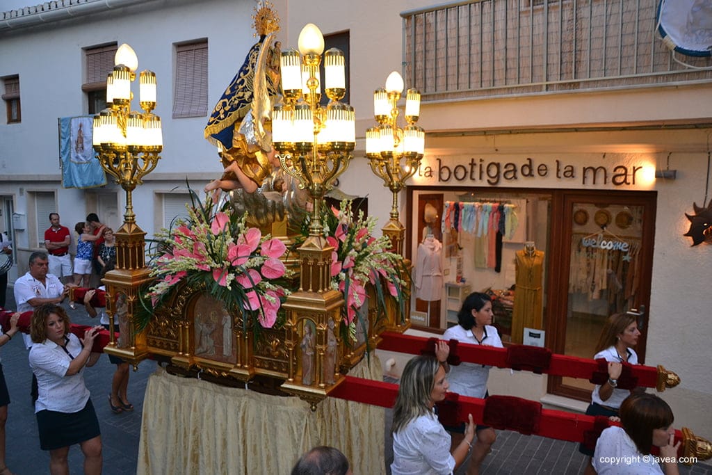 Salida de la imagen en procesión portada por las mujeres de la Penya Les Marineres