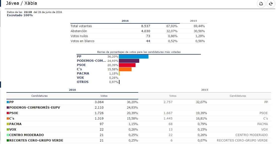 26 de junio de 2016 - 22:28Cuadro final de las Elecciones Generales del 26 de junio 1 de 2Foto SiguienteVer el artículo original: Los populares siguen siendo la fuerza más votada en Xábia Cuadro final de las Elecciones Generales del 26 de junio Votación en un colegio electoral de Xàbia