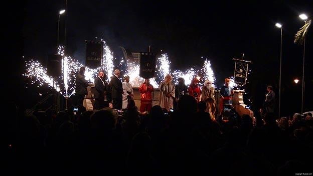 En la Lonja de Pescadores les aguardaba un gran séquito de pajes formado por estandartistas, abanderados y portadores de abanicos de plumas además de otros tantos encargados de repartir caramelos entre los más pequeños. Rápidamente, los Magos subieron a sus respectivas carrozas xabieras dispuestos a recorrer el municipio saludando y lanzando caramelos al gran público que salió a las calles a recibir a sus majestades.