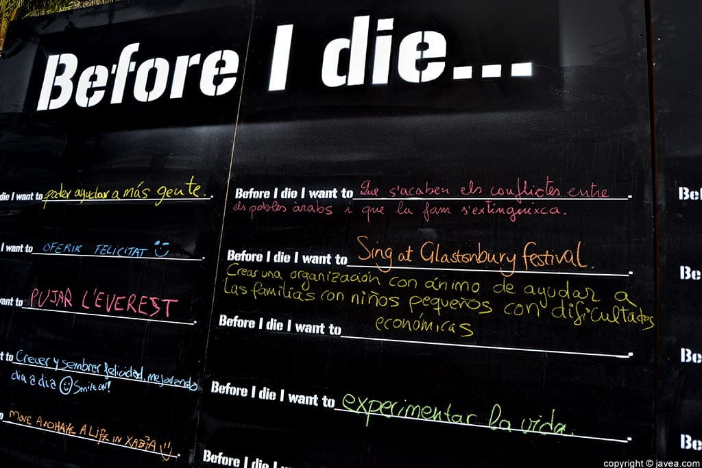 30 de julio de 2014 - 13:15Desde el primer momento los transeúntes han comenzado a llenar la pizarra con sus deseos y sueños. Foto Anterior2 de 7Foto SiguienteVer el artículo original: Los vecinos de Jávea ya han empezado a llenar la pizarra con sus retos y deseos Grupo de coaches responsables de la iniciativa Durante los primeros minutos de inaugurar la pizarra los transeúntes ya la han llenado con sus deseos y sueños Juan Luís Cardona Salvador escribiendo sus deseos en la pizarra de Before I die… Los transeúntes iban llenando la pizarra con sus deseos y retos Sueños y retos se pueden escribir en cualquier idioma en la pizarra de Before I die Todos los que pasaban por la pizarra escribían sus sueños e inquietudes Una vez la pizarra esté llena se borrarán los mensajes para que se puedan escribir de nuevos
