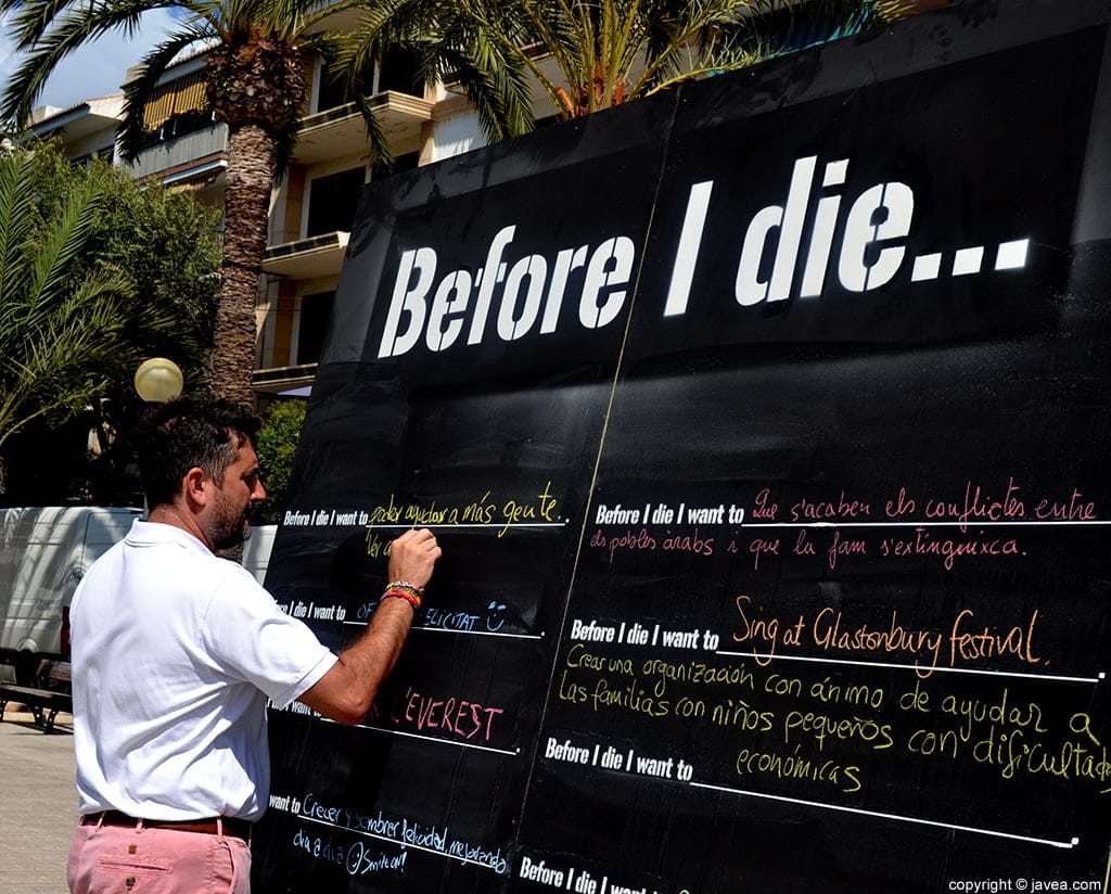 30 de julio de 2014 - 13:15El edil de Fomento Económico, Juan Luís Cardona, escribiendo en la pizarra sus retos y sueños. Foto Anterior3 de 7Foto SiguienteVer el artículo original: Los vecinos de Jávea ya han empezado a llenar la pizarra con sus retos y deseos Grupo de coaches responsables de la iniciativa Durante los primeros minutos de inaugurar la pizarra los transeúntes ya la han llenado con sus deseos y sueños Juan Luís Cardona Salvador escribiendo sus deseos en la pizarra de Before I die… Los transeúntes iban llenando la pizarra con sus deseos y retos Sueños y retos se pueden escribir en cualquier idioma en la pizarra de Before I die Todos los que pasaban por la pizarra escribían sus sueños e inquietudes Una vez la pizarra esté llena se borrarán los mensajes para que se puedan escribir de nuevos