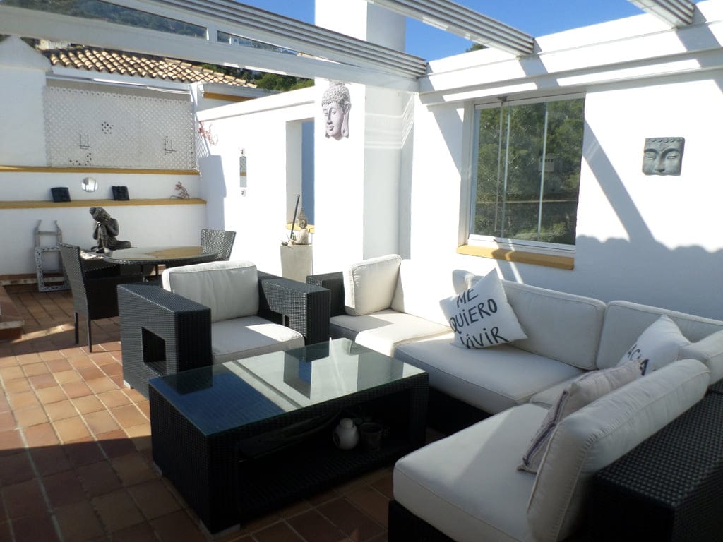 La vivienda dispone de ventanas de doble acristalamiento, SAT TV, ventiladores de techo en salón y dormitorio. Aprovechando el nicho del rellano en la planta solárium, se instaló una cama. La propiedad está amueblado en un estilo moderno y el precio incluye los muebles y electrodomésticos.