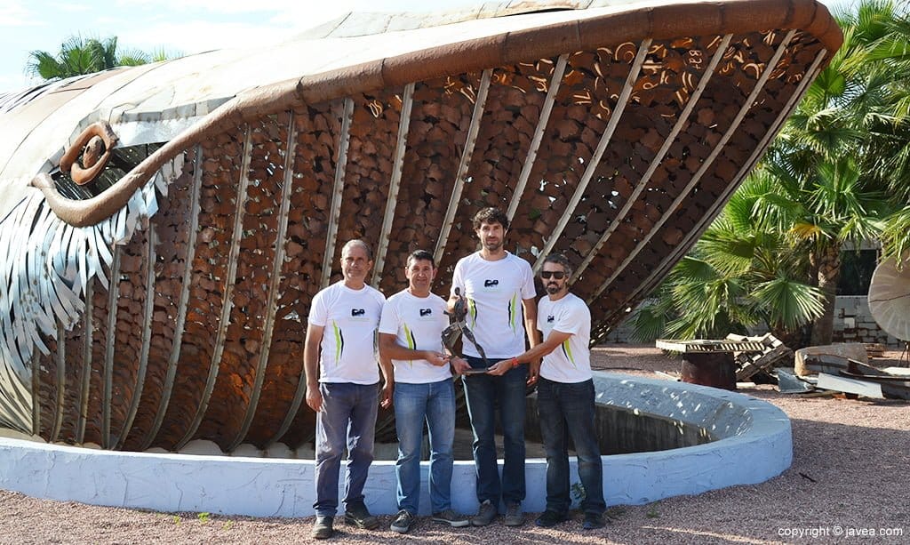 El presidente del Club Atletismo Llebeig Xàbia, Jaume Escortell, junto a uno de los miembros de su directiva, Juanjo Vallés y el presidente del XXI Circuit a Peu Marina Alta, Pep Giner, visitaron el taller de Toni Marí para ver como se remataba la estatua que recibirá el club xabiero.