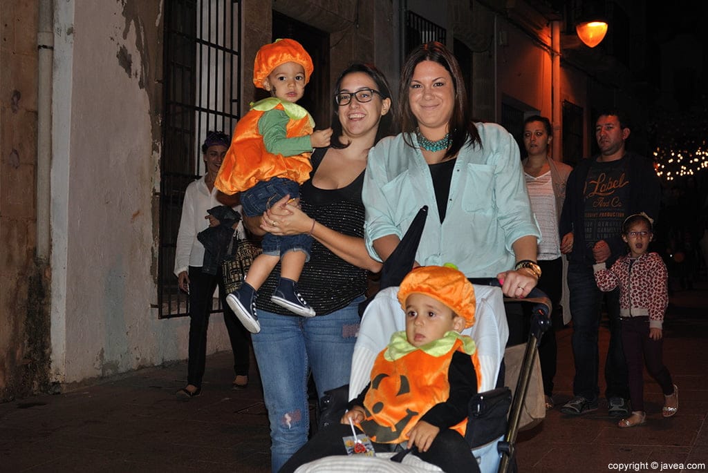 Fátima y María acompañan a dos simpáticas calabazas de Halloween durante el pasacalle a su paso por la Calle Mayor