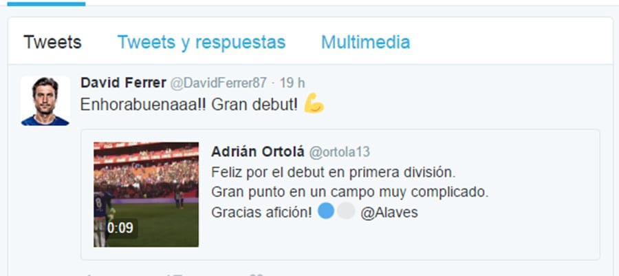 En este día tan especial para el guardameta de Xàbia, sus padres estuvieron en Bilbao dando el máximo respaldo al chaval. Entre las muchas felicitaciones que ha recibido Adrián. está la que le ha enviado su buen amigo, el tenista, David Ferrer, quien en un mensaje de twitter le dio la enhorabuena por el debut.