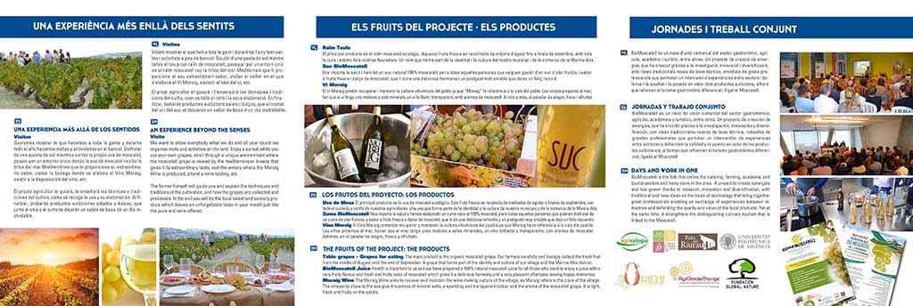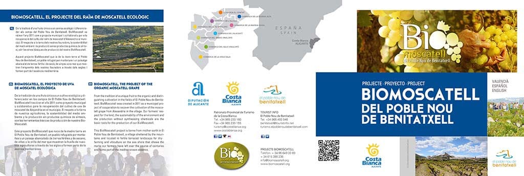 Por su parte, el tríptico, editado en tres idiomas, castellano, valenciano e inglés, explica las características del proyecto de uva de moscatel ecológica como una fruta única y un cultivo ecológico y diferenciador en los campos de El Poble Nou de Benitatxell. En los folletos se muestra la experiencia de las visitas organizadas a los bancales: Atardecer entre viñedos y Moscatell con los cinco sentidos, donde se puede disfrutar de una puesta de sol mientras el visitante recolecta su propia uva de moscatel.