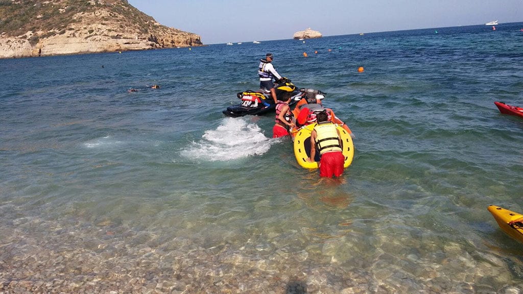 Por otra parte, la Policía Local también atendía sobre las 14:00 horas, a un hombre en la Cova del Llop Marí. El varón se encontraba exhausto sobre una tabla de surf. La Policía Local ha remolcado al surfista con la moto acuática hasta la Granadella.