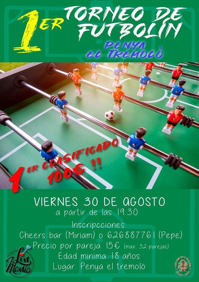 19:00 horas: I Torneo de Futbolín organizado por la Peña El Tremoló y patrocinado por Linmania en la calle Virgen de Loreto. Las inscripciones podrán realizarse contactando con los miembros de la peña. Habrá servicio de barra y música para amenizar el ambiente.
