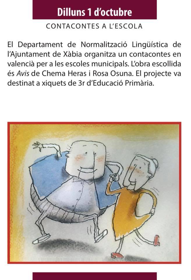 Con motivo de la celebración del 9 de octubre, los más pequeños tendrán un espacio en esta programación de la mano del departamento de Normalització Lingüística, que visitará todos los colegios para llevar a las aulas de tercero de primaria el cuentacuentos Avis.
