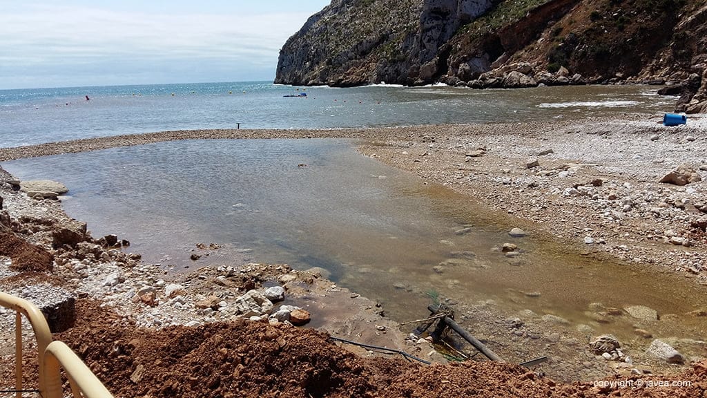 El temporal de esta pasada noche ha hecho estragos en las dos calas más emblemáticas de Xàbia: La Granadella y en menor medida la Barraca. Esta mañana, los servicios de limpieza y los propietarios de negocios se afanaban en dejar las cosas en su sitio. Una máquina intentaba dejar la entrada de la Granadella en condiciones ya que el temporal había levantado la acometida de agua y hasta pasado el mediodía la Cala estaba sin servicio.