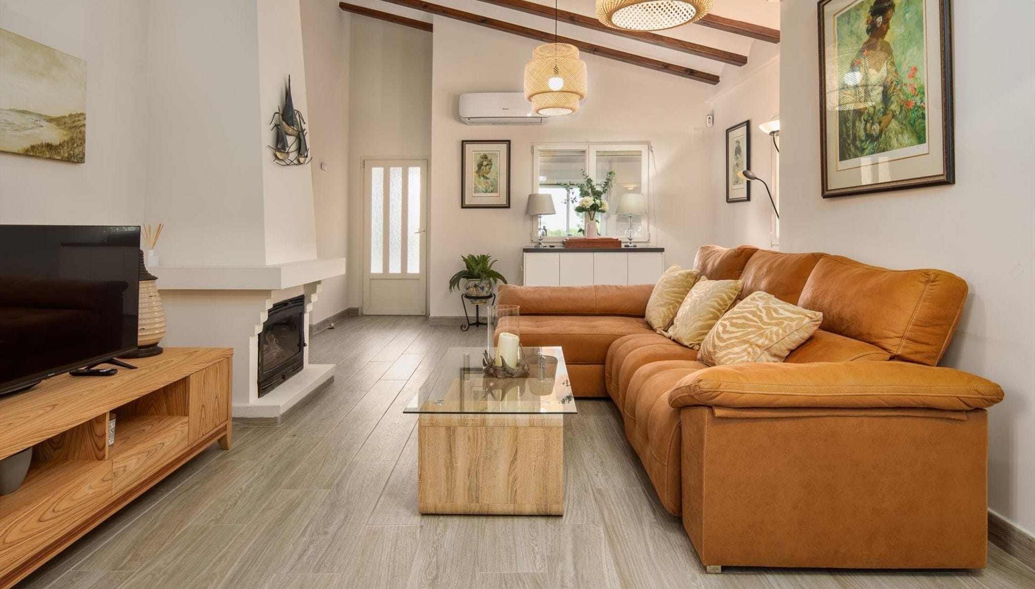 Salón muy bien decorado con una mesita acristalada y un gran sofá lounge color desde el que ver la TV