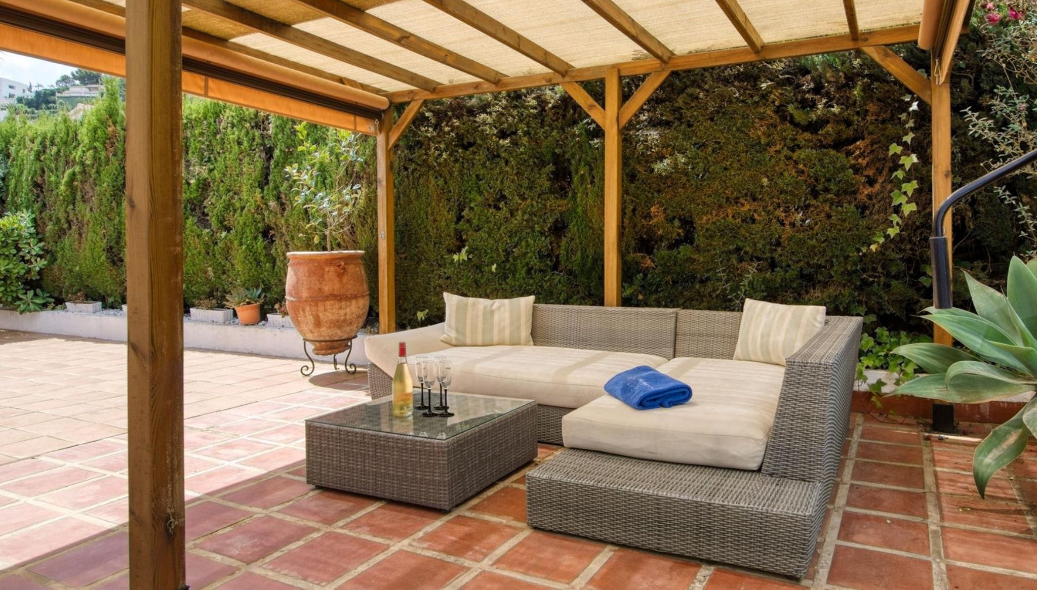 08 de julio de 2022 - 10:17La casa está rodeada de terrazas que cuentan con zonas de descanso Foto Anterior13 de 13Ver el artículo original: Una estancia de ensueño en La Sella: disfruta de la paz y tranquilidad de esta casa vacacional con piscina Baño en suite con bañera Bonito salón con cocina abierta Casa de vacaciones Ensueño en el complejo residencial Los Naranjos en La Sella Cocina moderna y completamente equipada Comedor con acceso a la terraza Cuarto de baño con plato de ducha Dormitorio doble con ventana exterior Encantador dormitorio con cama de matrimonio Piscina doble con aguas azul turquesa Rincones acogedores para relajarse Salón con sofá color caramelo y mesa acristalada Terraza cubierta con mesa y sillas para comer Zona chill out cubierta con toldo