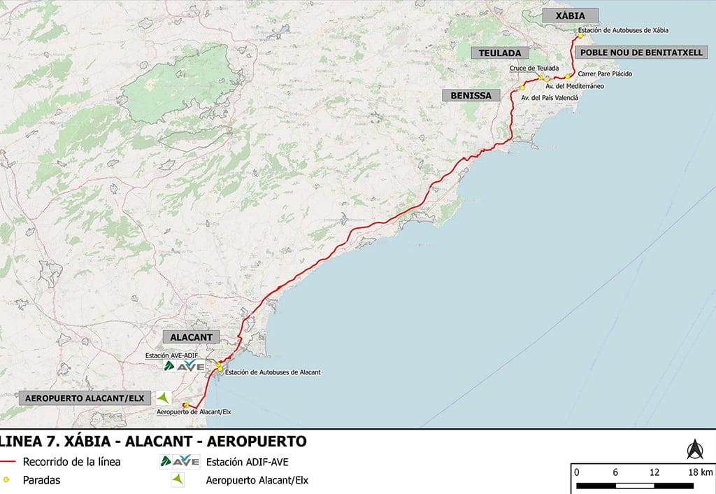 En este nuevo servicio destacan las líneas 4, 6 y 7, que proporcionan servicios troncales por vía rápida a núcleos de gran relevancia turística como Calp, Altea, Dénia, Xàbia o Teulada. En concreto, la línea 7 es la que corresponde a Xàbia, que según marca el anuncio tendrá tres expediciones diarias tanto de salida como de vuelta. Saldrá de la estación de autobuses en dirección Alicante (AVE-Aeropuerto) y hará paradas en Teulada y Benissa cogiendo posteriormente la autopista hasta la ciudad de Alicante. Itinerario: Xàbia (Estación de autobuses)–N-332–El Poble Nou de Benitatxell–N-332-Teulada–N-332–Benissa–AP-7 –A-70-N-332-Alacant (ADIF/Estación)– N-332–N-338-Aeropuerto.