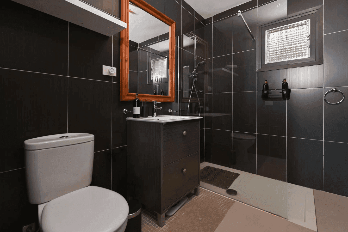 Este elegante baño, decorado en tonos negros, cuenta con una ducha y mampara de cristal, así como un lavabo