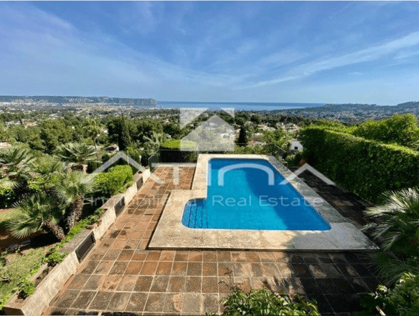 Vista panorámica desde la terraza superior de la piscina en el nivel inferior y las vistas impresionantes de la costa de Jávea
