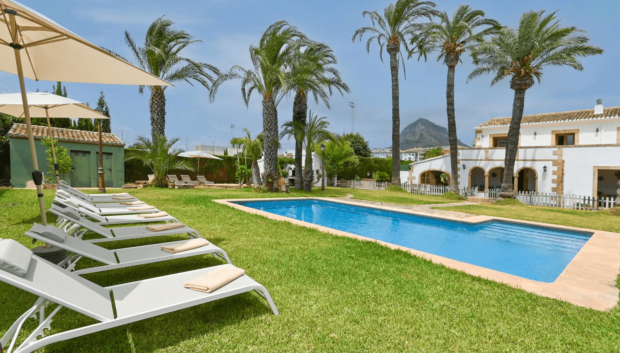 Piscina privada rodeada de vegetación y tumbonas