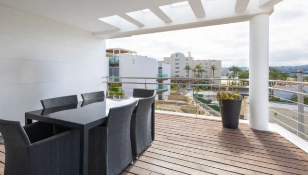 Los balcones del ático permiten disfrutar de vistas abiertas al Mediterráneo y al paisaje de montaña que rodea Jávea. Un lugar perfecto para desayunar al aire libre, relajarse por la tarde o simplemente contemplar el horizonte.