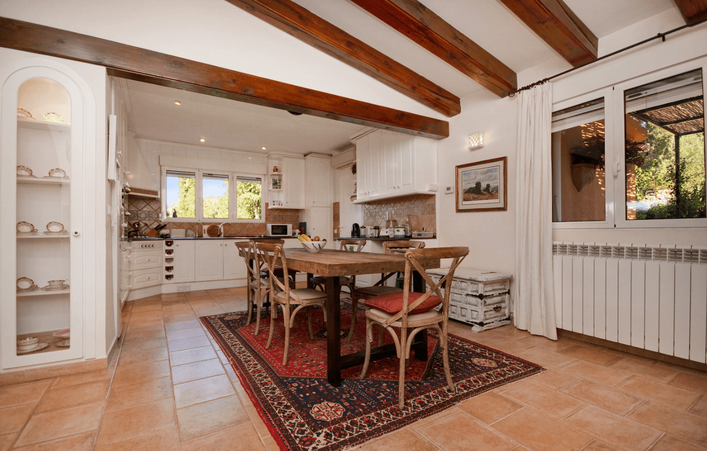 La zona de comedor interior se ubica junto a la cocina y está compuesta por una mesa de madera de estilo rústico y seis sillas a juego