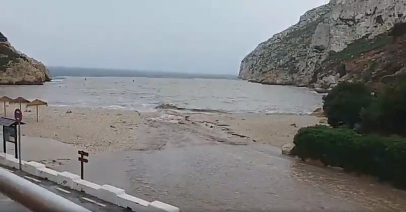En la Cala de la Granadella, hasta el momento se han registrado cerca de 56 litros, lo que ha provocado que el barranco volviera a bajar hasta el mar causando una división de la Cala (vídeo).