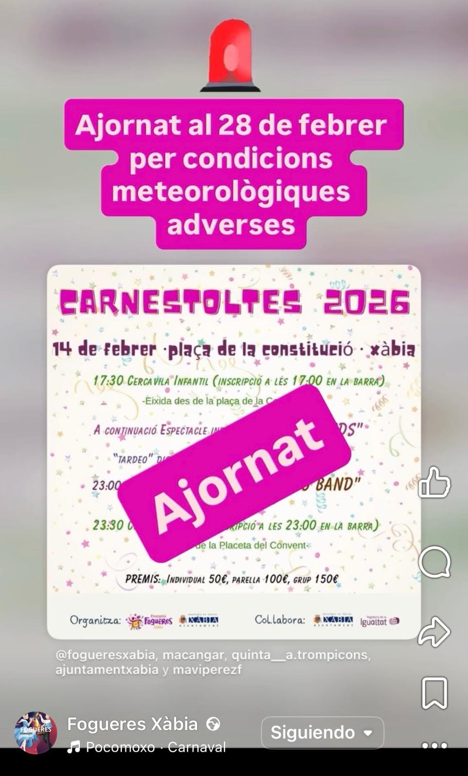 12 de febrero de 2026 - 16:09 1 de 2Foto SiguienteVer el artículo original: Xàbia aplaza la celebración del Carnaval debido a las condiciones meteorológicas adversas Cartel aplazamiento Carnaval Xàbia Cartel aplazamiento Carnaval Xàbia