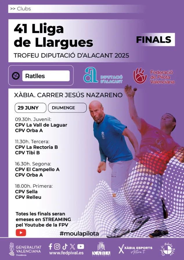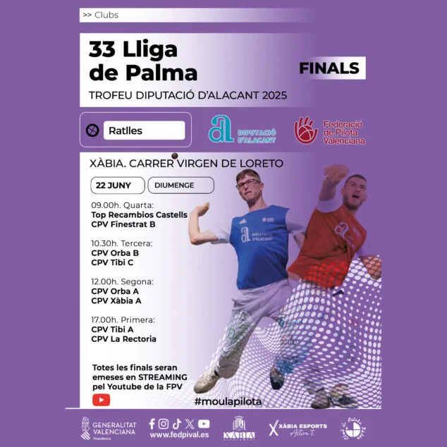 El municipio de Xàbia será el escenario de las ocho finales de las Lligues de Palma y Llargues los días 22 y 29 de junio, en un evento histórico que se podrá seguir en directo a través del canal de YouTube de la Federació de Pilota Valenciana (FPV).