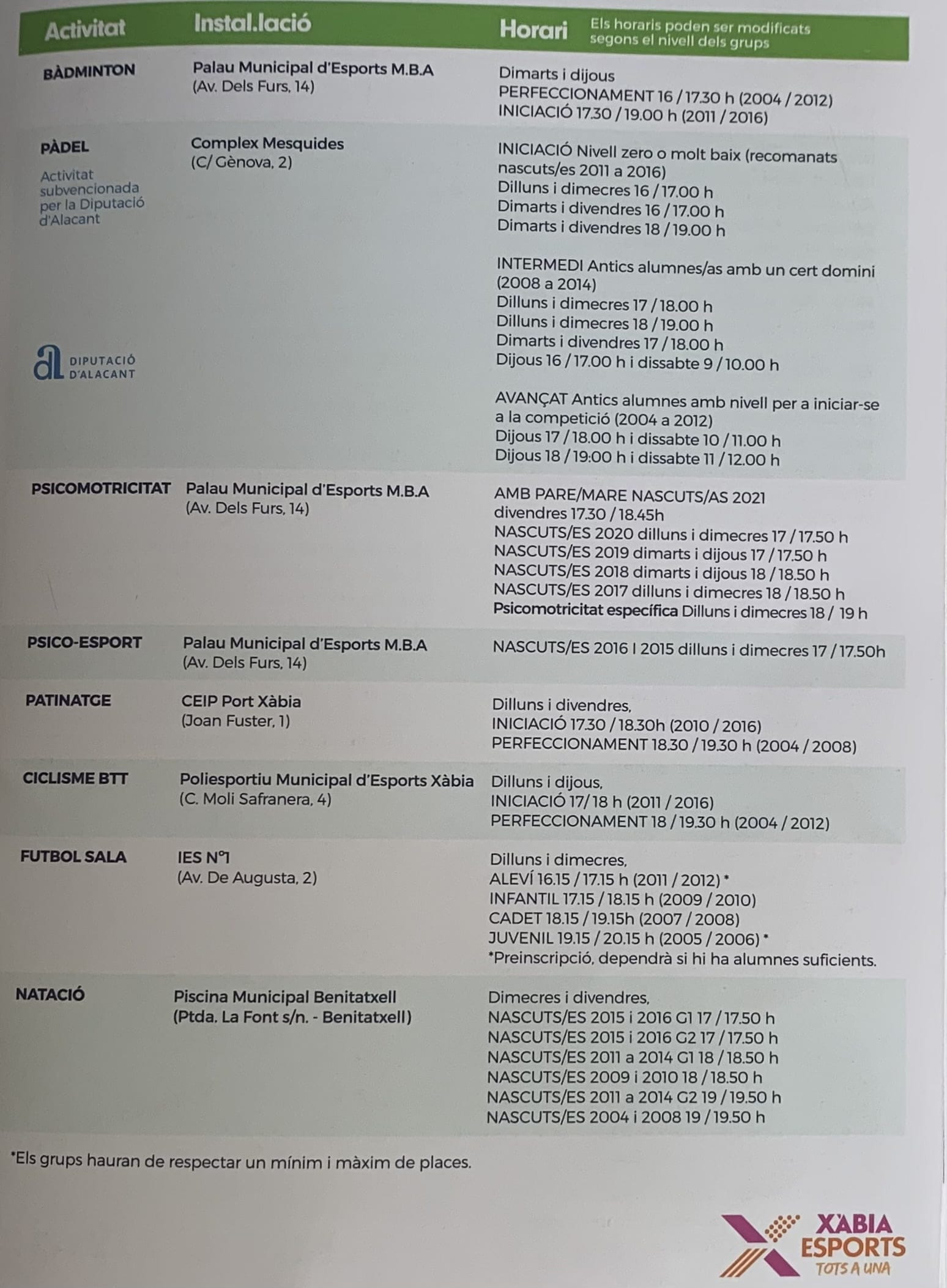 25 de julio de 2022 - 16:25 Foto Anterior3 de 4Foto SiguienteVer el artículo original: Xàbia Esports presenta toda la oferta deportiva y novedades para la temporada 2022-2023 Presentación de las Escuelas Deportivas Xàbia 2022-2023 Oferta deportiva de Clubs Xàbia Oferta de actividades deportivas municipales Actividades deportivas adultos Xàbia