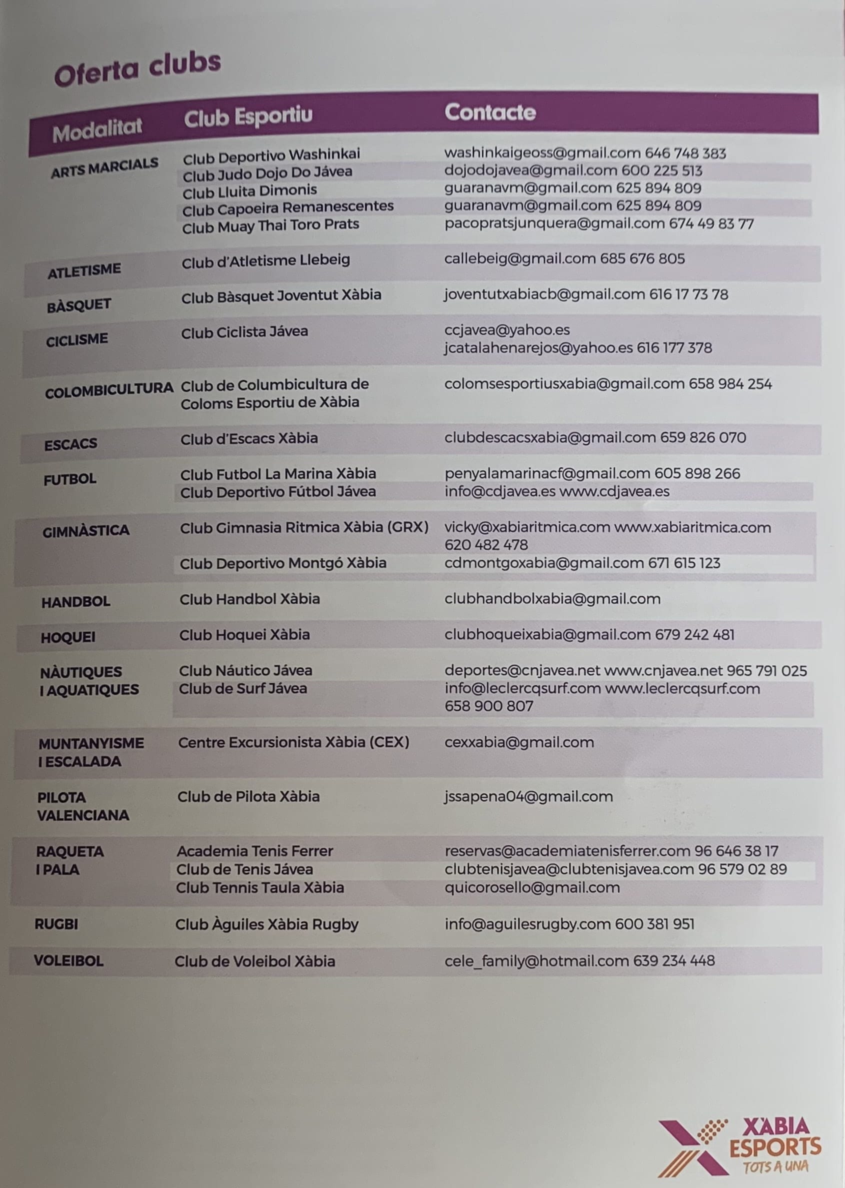 25 de julio de 2022 - 16:24 Foto Anterior2 de 4Foto SiguienteVer el artículo original: Xàbia Esports presenta toda la oferta deportiva y novedades para la temporada 2022-2023 Presentación de las Escuelas Deportivas Xàbia 2022-2023 Oferta deportiva de Clubs Xàbia Oferta de actividades deportivas municipales Actividades deportivas adultos Xàbia