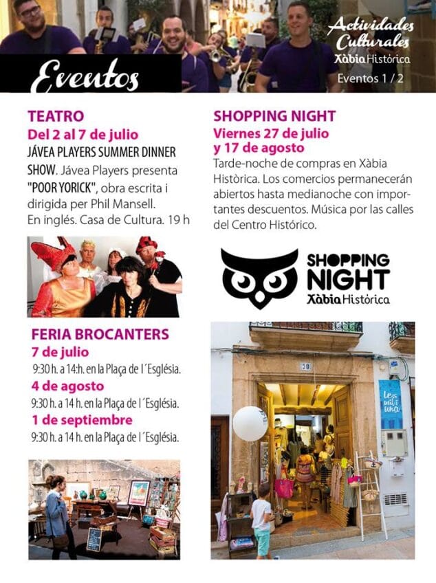 Por un lado se encuentran las citas comerciales, la Shopping Night, con la que los comercios ofrecen sus productos a un mejor precio durante toda la noche. La primera noche de compras del verano será el viernes 27 de julio la cual irá unida a la música en la calle y la mejor oferta gastronómica en los bares y restaurantes de Xàbia Histórica. La segunda Shopping Night será el 17 de agosto.
