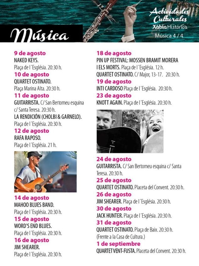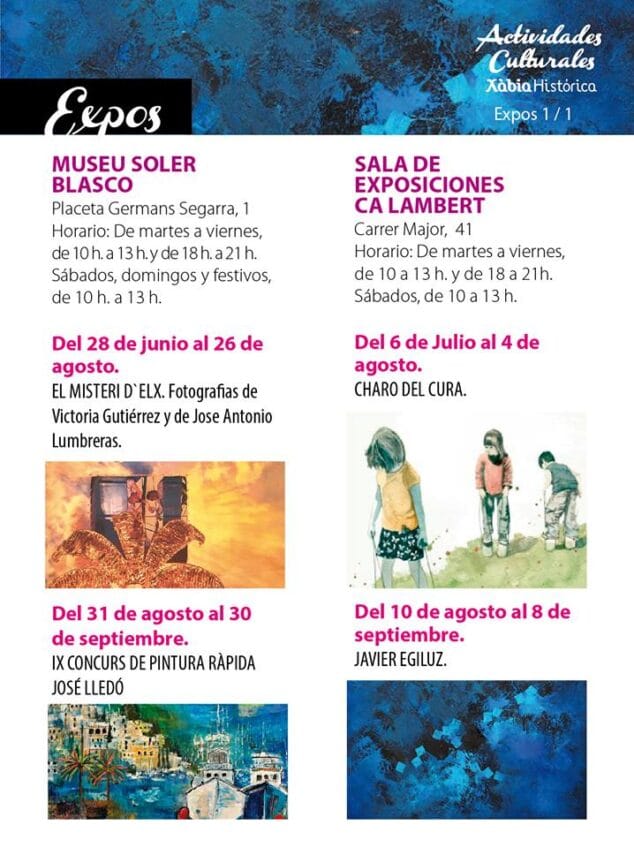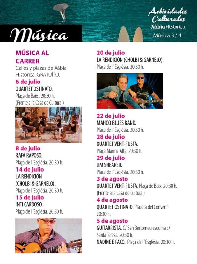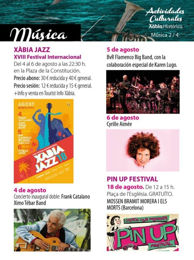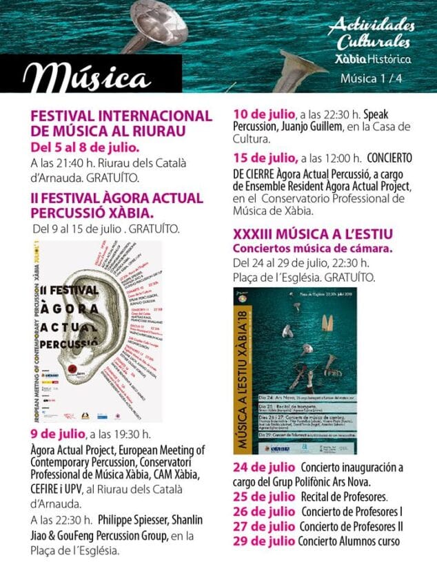 Por otro lado, Xàbia Histórica acogerá también festivales de música, exposiciones, rutas guiadas, etc. El consolidado festival de Xàbia Jazz en agosto, el II Festival Àgora Percussió del 9 a 16 de julio, el Soundpainting y el Festival de Música a l’estiu son algunas de las actividades culturales programadas para este verano donde la oferta turística y cultural no falla en el centro histórico de Xàbia.