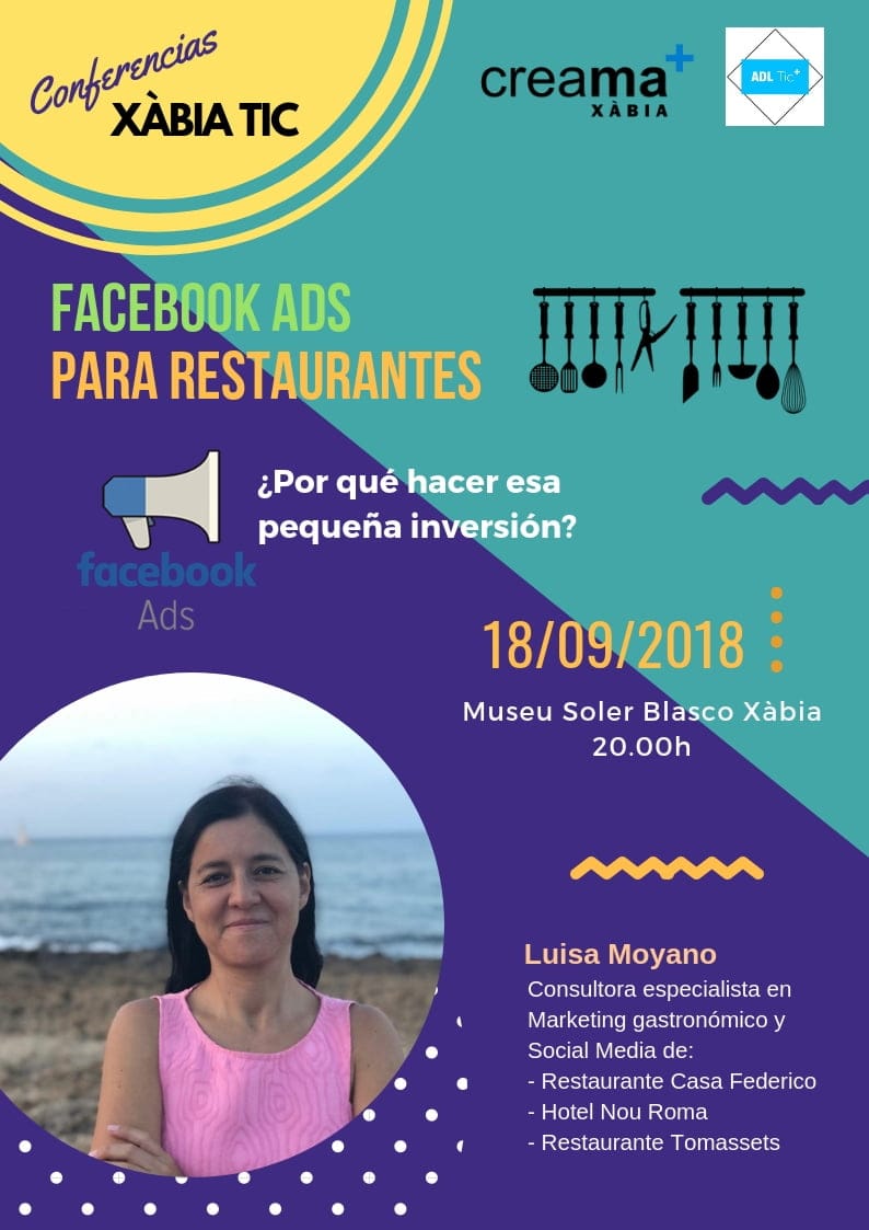 Una acción puesta en marcha desde el departamento de Fomento Económico de Xàbia, dentro del programa Beachworking y XàbiaTIC, en la que Luisa Moyano, Social Media experta en marketing gastronómico y gestora de las redes sociales de restaurantes impartirá una conferencia sobre cómo realizar una pequeña inversión en Facebook ads para traer interesantes beneficios y cuál es la mejor manera de hacerlo.