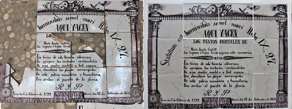 Ahora, después de llevar a cabo distintas intervenciones para recuperar su patrimonio, como haber restaurado las puertas, cambiado los cerramientos de las ventanas y renovado la instalación eléctrica, entre otras, el Museu Soler Blasco de Xàbia ha restaurado y montado, a través de la restauradora Maite Gayde, diez plafones funerarios de cerámica, originarios del antiguo cementerio.