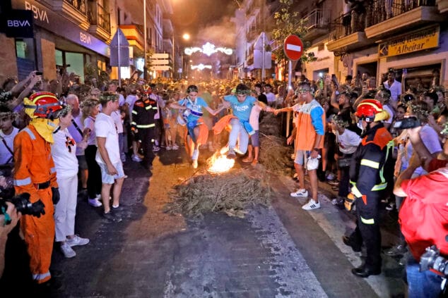 Con la llegada de la medianoche, tomaron protagonismo los tradicionales fuegos. Las siete hogueras que recorren el centro histórico para el salto de vecinos y visitantes, siendo una Fiesta de Interés Turístico Local de la Comunitat Valenciana. La organización de este acto corrió a cargo de la comisión de fiestas y de la Quintà del 25 aniversario, ‘L’Última Fornà’.